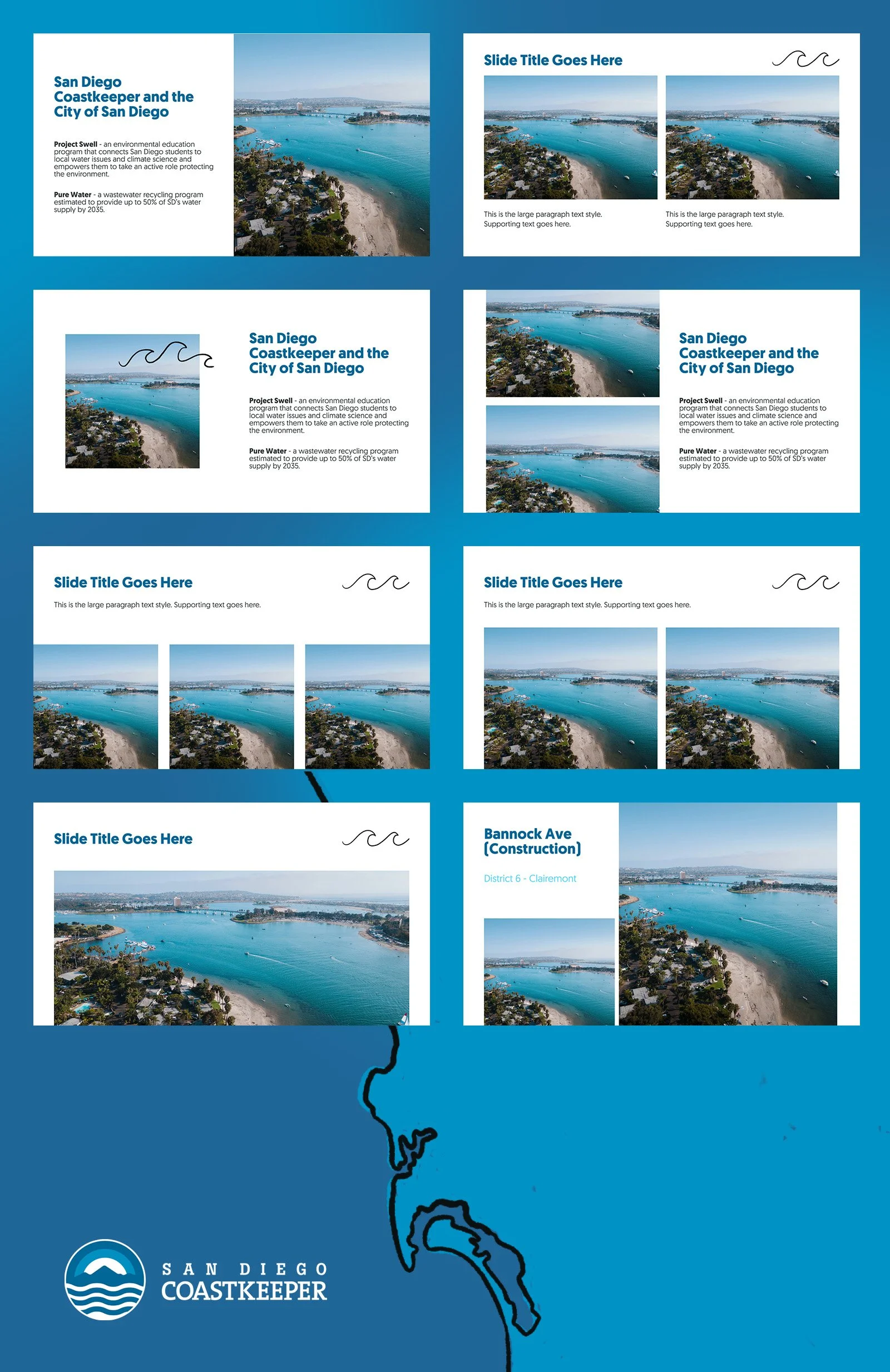 I volunteered with the San Diego Coastkeeper marketing team on a custom design project. Our goal was to create a set of presentation templates that would enable their internal team to quickly create consistent, on-brand educational content for any of their various community outreach programs. To set the team up for future success in designing on their own I created a library of pre-designed slides and provided guidance on how to use the presentation template. As part of the project, I created a custom set of hand-drawn icons which were complementary to the existing brand visuals and could be used across presentations or any other branded assets as needed.